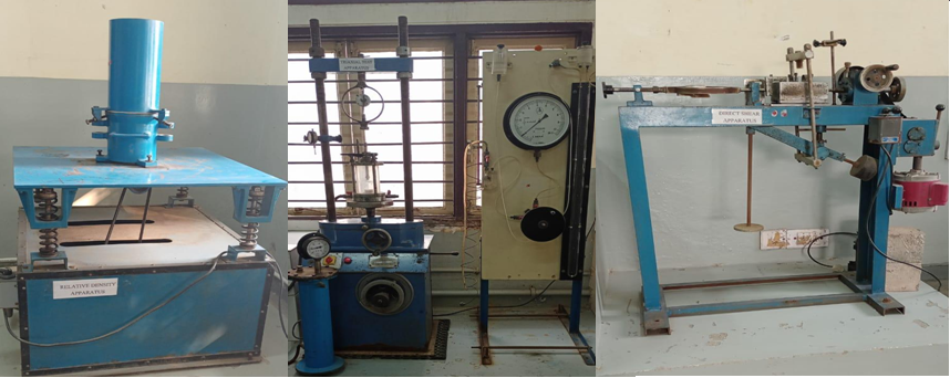 | Geotechnical Engineering Laboratory | Direct Shear Test, Permeability apparatus, Tri-axial setup, Atterberg limits setup, Compaction mould, Core cutter and accessories, Sand replacement setup, Hydrometer, Split spoon, Standard penetration test apparatus, Relative density apparatus. |